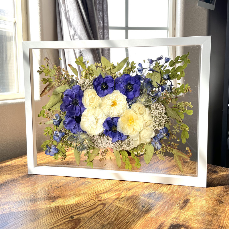 Desert Rose Floral Preservation focuses on preserving your fresh floral arrangements from the special events in your life. Wedding's, funeral's, and more. Each floral arrangement is broken down from the presentation state and dried completely before being casted in UV resistant, crystal clear epoxy resin that is fixed into your choice of frame with a glass surface.